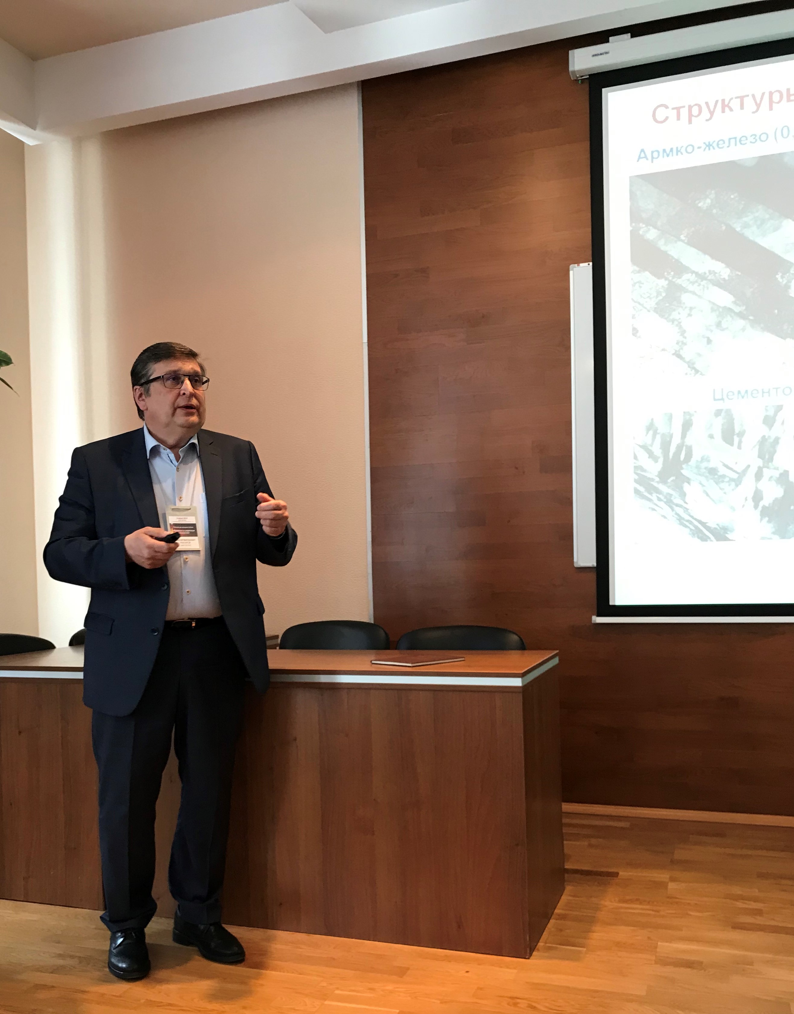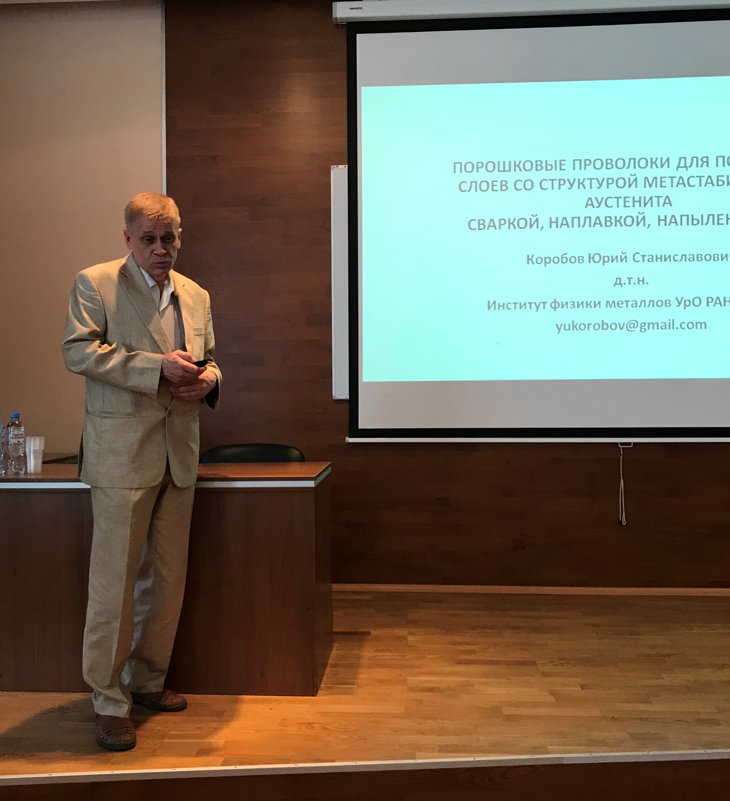 Заведующий лабораторией ИФМ, д.т.н. Коробов Юрий Станиславович сделал доклад на тему «Порошковые проволоки для получения слоев со структурой метастабильного аустенита сваркой, наплавкой, напылением».