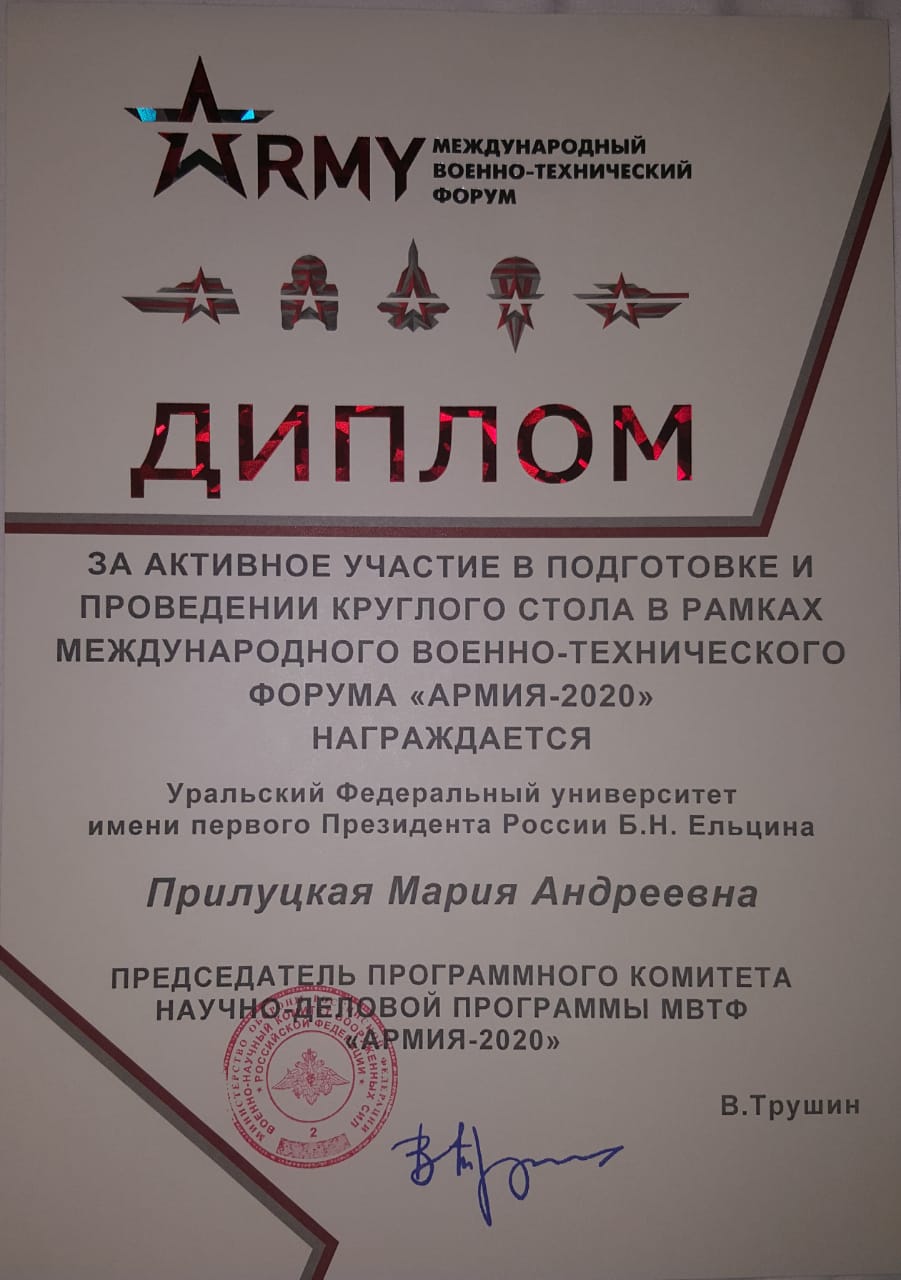 По итогам Прилуцкая Мария Андреевна получила Диплом за активное участие в подготовке и проведении круглого стола в рамках от Программного комитета научно-деловой программы МВТФ «Армия-2020».