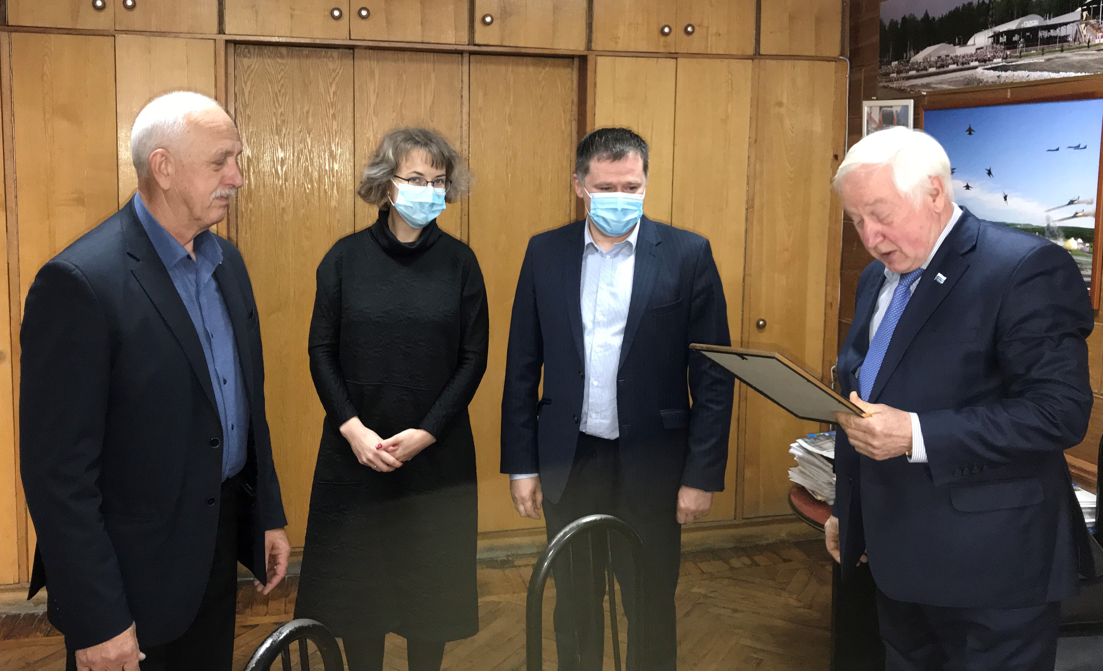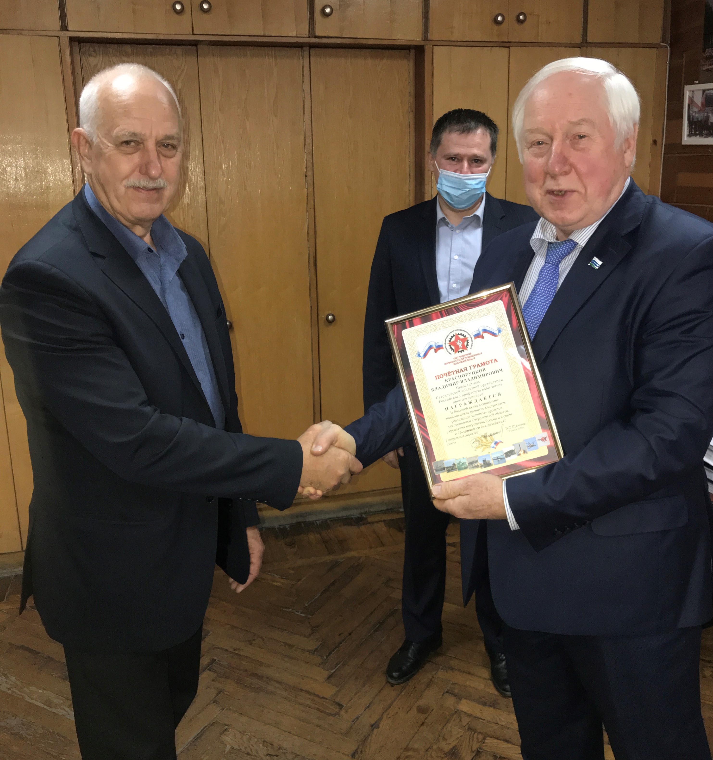 По окончании совещания Щелоков В.Ф. поздравил Красноруцкого В.В. с прошедшим юбилейным днем рождения, вручил ему Почетную грамоту Союза предприятий оборонных отраслей промышленности Свердловской области, памятную медаль «100 лет ВЛКСМ» и памятный сувенир.