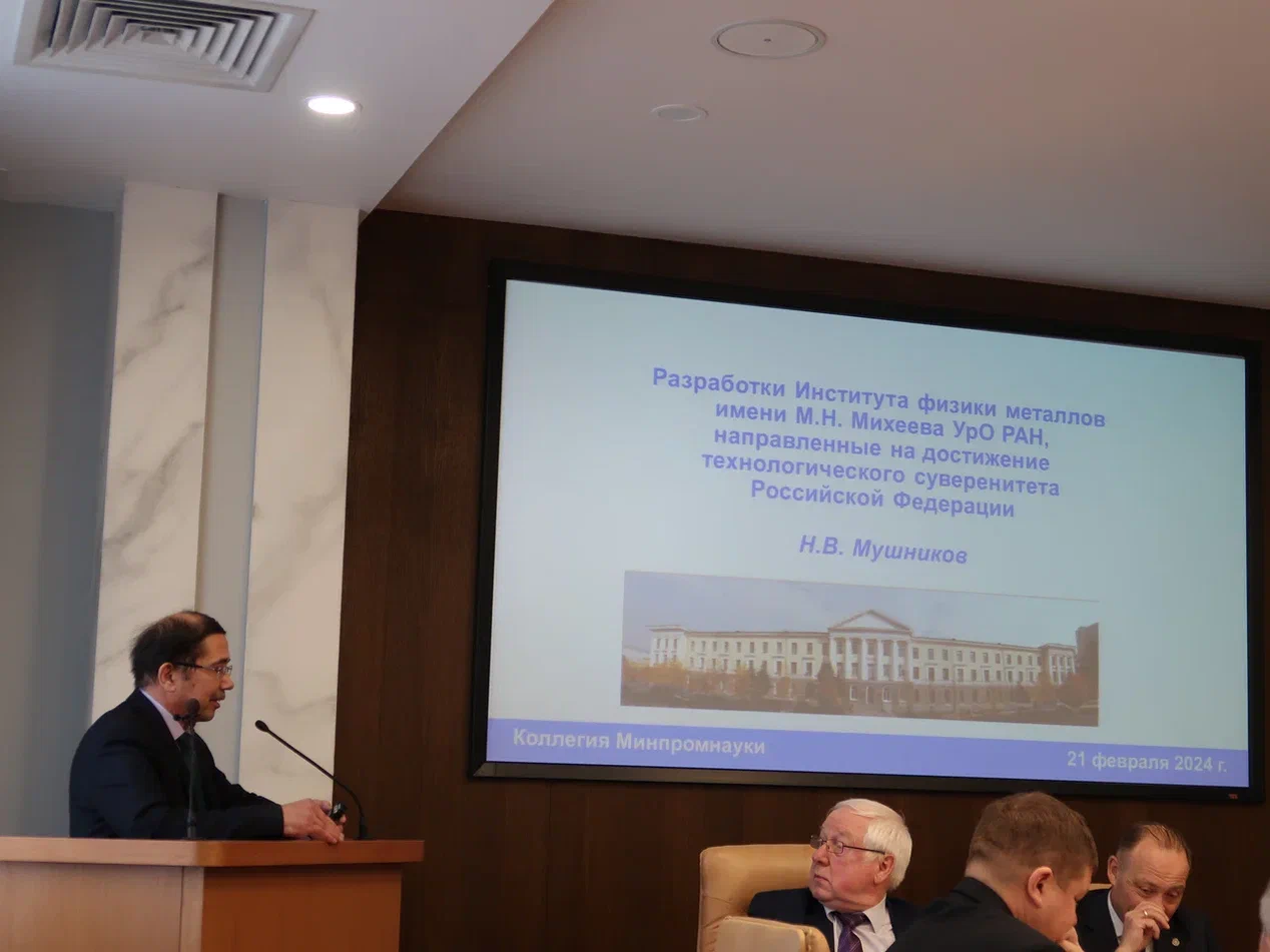 По вопросам развития сотрудничества с институтами Уральского отделения Российской академии наук в решении задач достижения технологической независимости выступили с докладами Мушников Николай Варфоломеевич - директор Института физики металлов им. М.Н. Михеева УрО РАН, академик РАН и Ремпель Андрей Андреевич - директор Института металлургии УрО РАН, академик РАН.