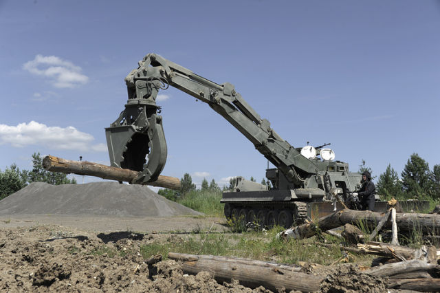 Вместе с боевыми машинами в составе экспозиции инженерных войск Минобороны на выставке показали и уникальный бронированный бульдозер Б10М2С.