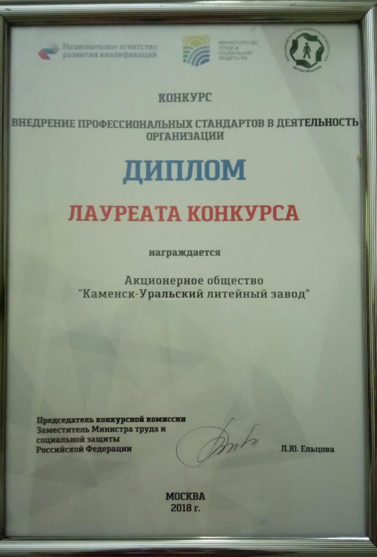 6-7 декабря в Москве прошел форум «Национальная система квалификаций России-2018», в рамках которого были подведены итоги конкурса «Внедрение профессиональных стандартов в деятельность организации», проводимого под эгидой Министерства труда и социальной защиты Российской Федерации. В число лауреатов вошел Каменск-Уральский литейный завод холдинга «Технодинамика» Госкорпорации Ростех.