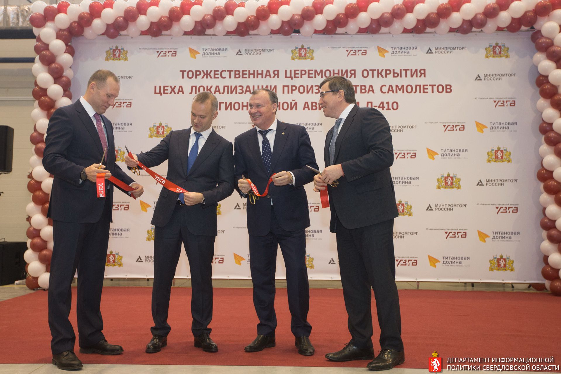 Красную ленту разрезали заместитель министра промышленности и торговли Олег Бочаров, первый вице-губернатор Свердловской области Алексей Орлов, генеральный директор АО «Уральский завод гражданской авиации» Вадим Бадеха и генеральный директор особой экономической зоны «Титановая долина» Артемий Кызласов.