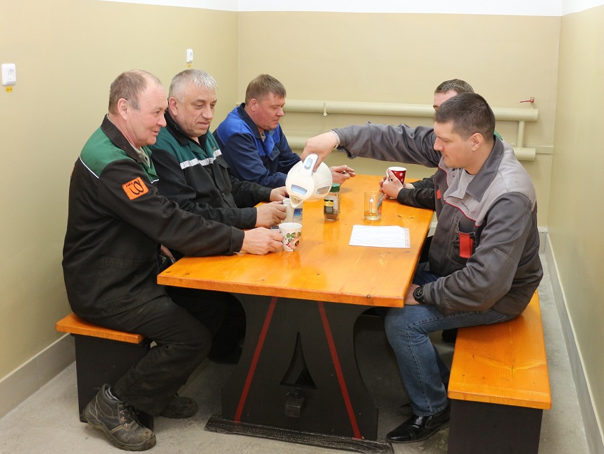 Раньше в ремонтно-механическом цехе не было специальной комнаты приема пищи. По настоянию профсоюза, такой пункт стал частью коллективного договора и сегодня выполнен. Для этого работники подразделения освободили старую кладовую, где сделали капитальный ремонт: подвели тепло, воду, покрасили стены, прикрепили подвесной потолок, новые светильники. Сегодня здесь установлены мебель и бытовые приборы.