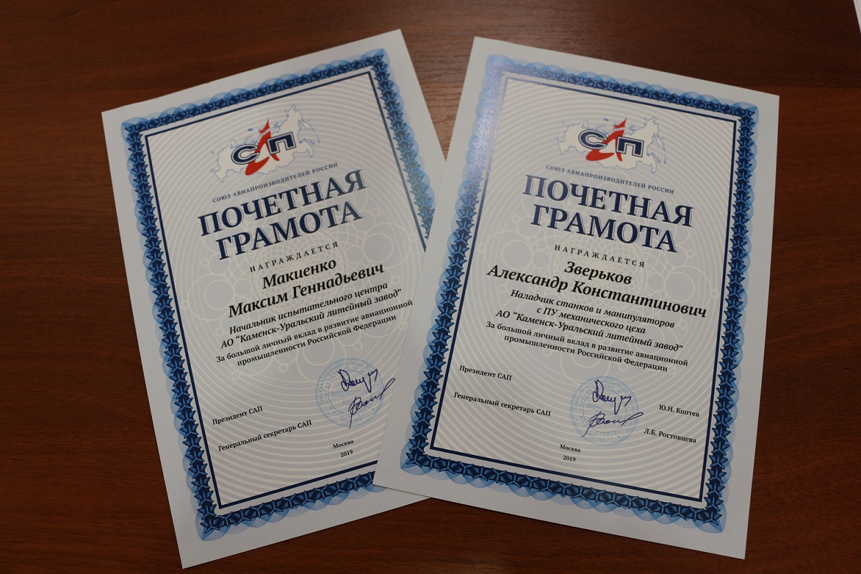 Награды высокого полета получили трое работников Каменск-Уральского литейного завода ко Дню машиностроителя. Кулзовцев отметил почетными грамотами Союз авиапроизводителей России.За большой вклад в развитие авиационной промышленности эта авторитетная организация поощрила наладчика станков и манипуляторов с программным управлением Александра Зверькова, инженера-технолога Елену Колесникову и начальника заводского испытательного центра Максима Макиенко.