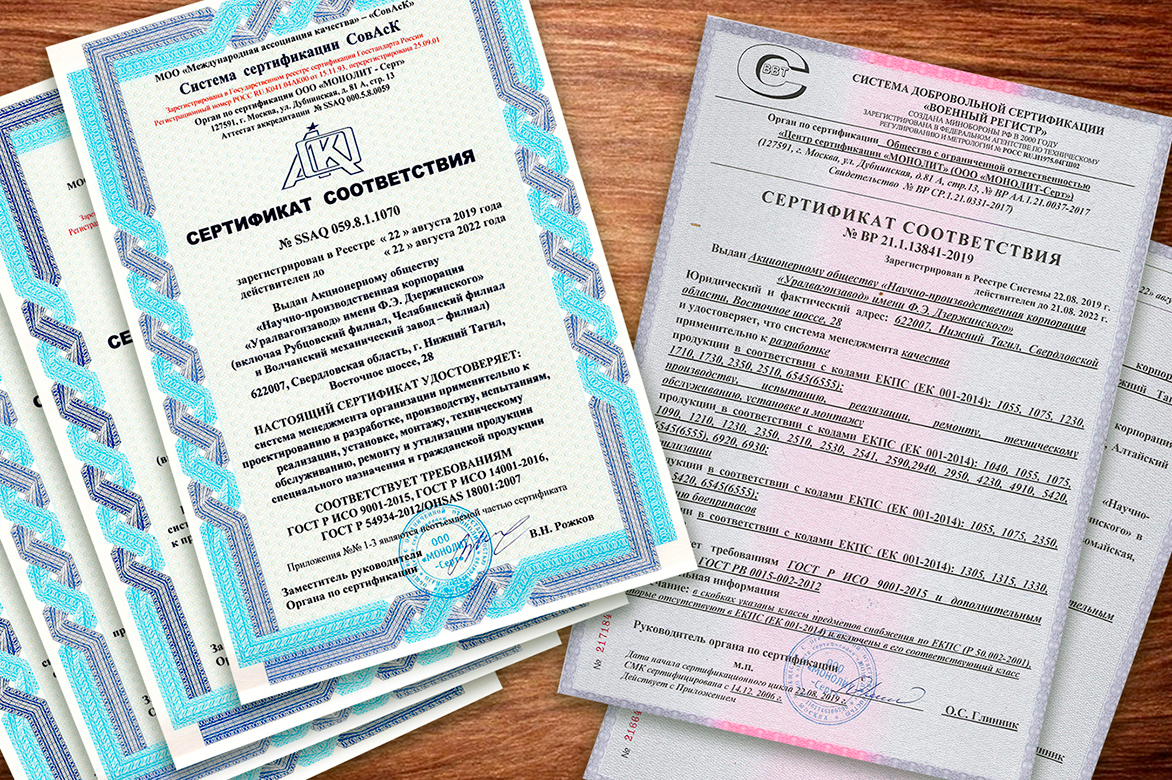 Система менеджмента качества (СМК) применительно к военной продукции также подтверждена сертификатом соответствия новым требованиям и военным стандартам в системе сертификации «Военный регистр».