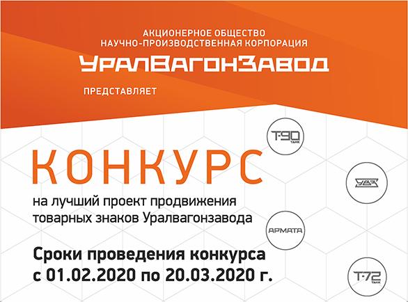 Корпорация Уралвагонзавод объявляет конкурс на лучший проект продвижения товарных знаков. Речь о таких известных наименованиях, как «УВЗ», «Армата», «Т-72» и «Т-90». Это самые узнаваемые товарные знаки, имеющие историческую, коммерческую и репутационную ценность не только для Корпорации, но и всей страны. Принять участие в конкурсе может любой желающий. Призовой фонд составляет 150 тысяч рублей.