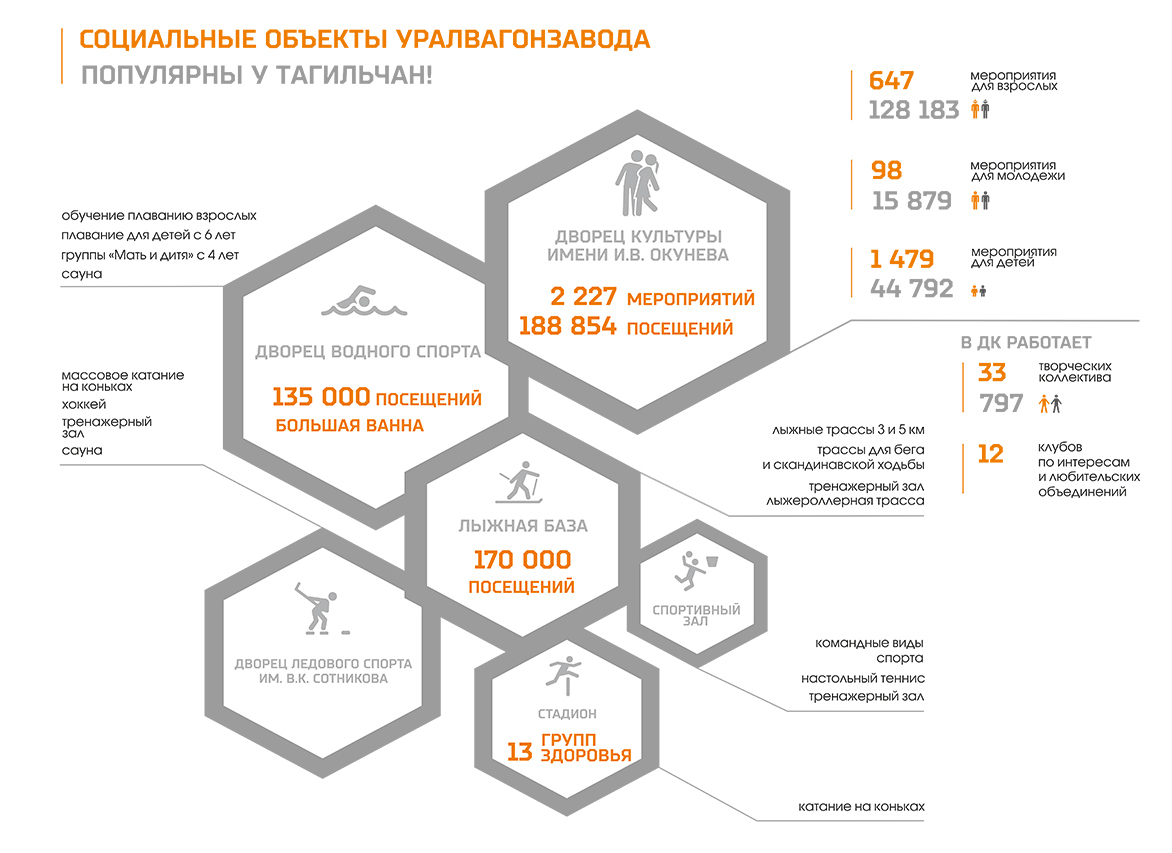 Дворец культуры имени И.В. Окунева, Дворец водного спорта и лыжная база стали самыми популярными среди тагильчан. В 2019 году их посетили свыше 494 000 раз. Все соцобъекты Уралвагонзавода – более 500 000.