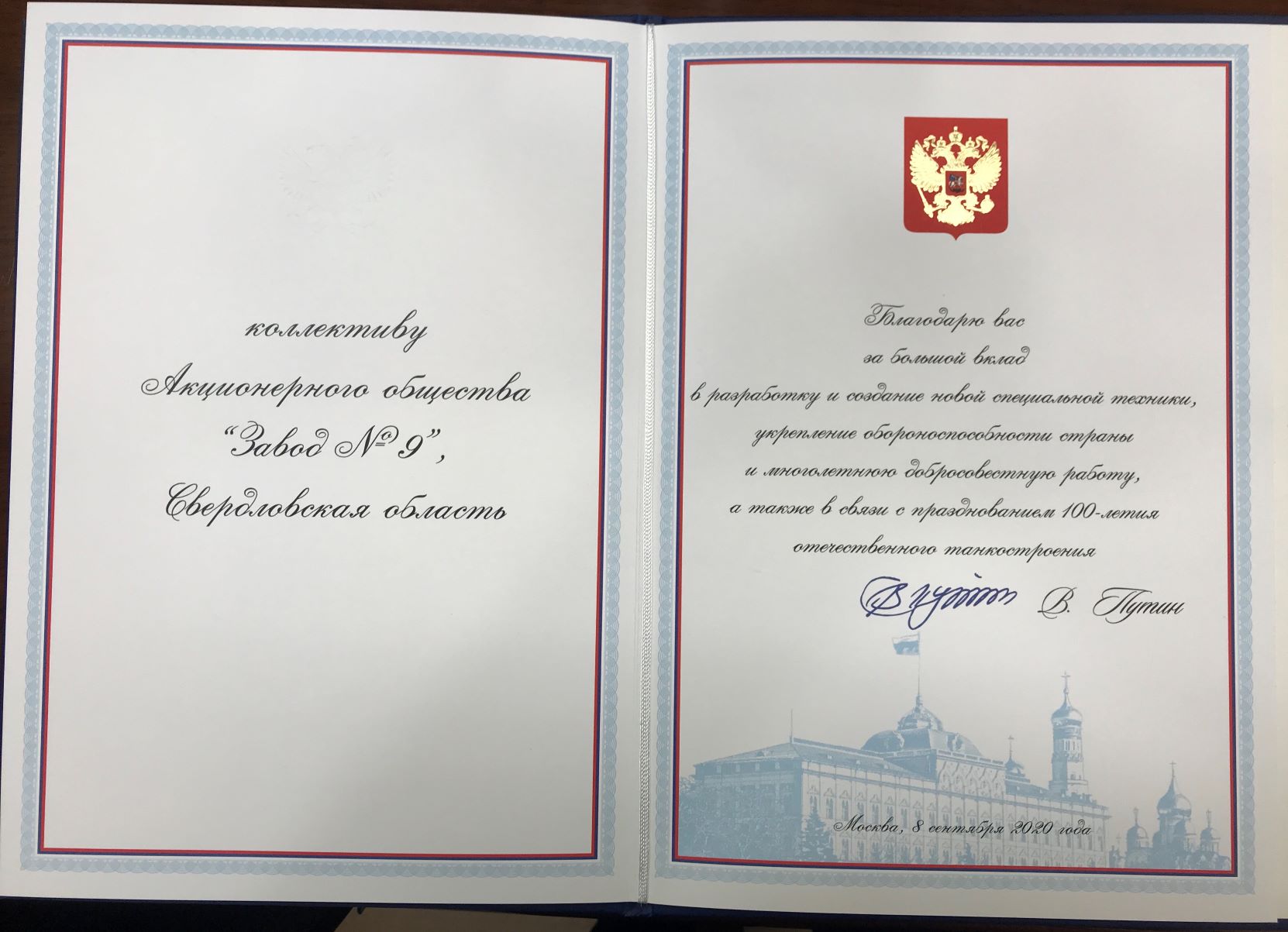Коллектив АО «Завод № 9» получил Благодарственное письмо Президента России за большой вклад за разработку и создание новой специальной техники, укрепление обороноспособности страны и многолетнюю добросовестную работу, а также в связи с празднованием 100-летия отечественного танкостроения.