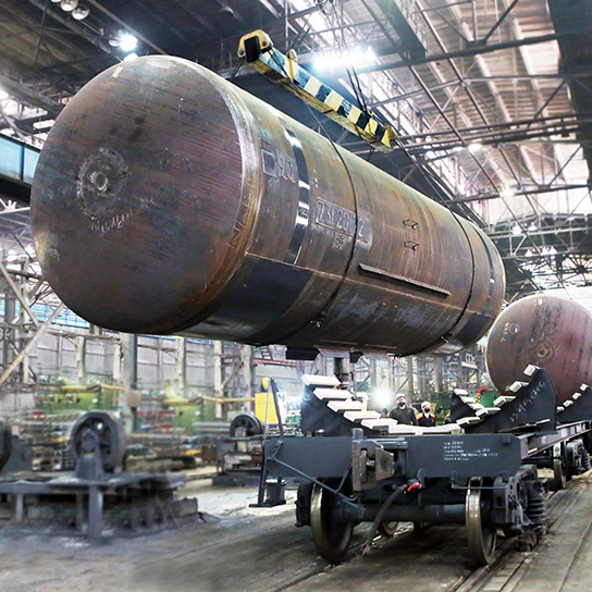 Всё начинается с пяти листов металлопроката разной толщины. Из них собирают карту, сваривают. Потом на вальцовочной машине металл сворачивают в цилиндр диаметром 3 200 мм. Специалисты называют его обечайкой. Далее к ней стыкуют днища. После ультразвукового контроля приваривают остальные комплектующие: горловину люка, лестницы, сливной прибор и другие. Готовый котел тщательно проверяют на герметичность, затем устанавливают на платформу. Эту часть вагона собирают в цехе 320, а также на волчанской площадке Уралвагонзавода.
