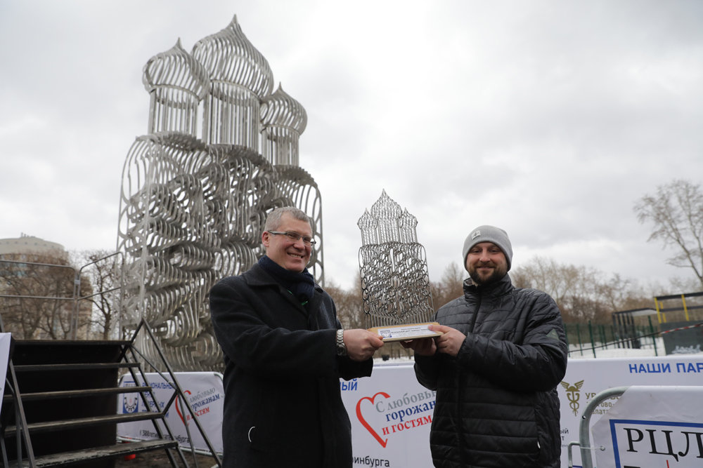 Открытие необычного объекта на площадке у Дворца игровых видов спорта стало праздником для уральцев - с народными танцами, исполнением песен о Екатеринбурге и, конечно, знаменитой песняровской "Вологды" под баян. Правда, зрители делили свое внимание поровну - глядя на сцену, то и дело посматривали в сторону удивительного сооружения, словно кружево, сплетенного из полос нержавеющей стали. Его эскиз разработали в Вологде, но воплотить в жизнь смогли только на Урале.