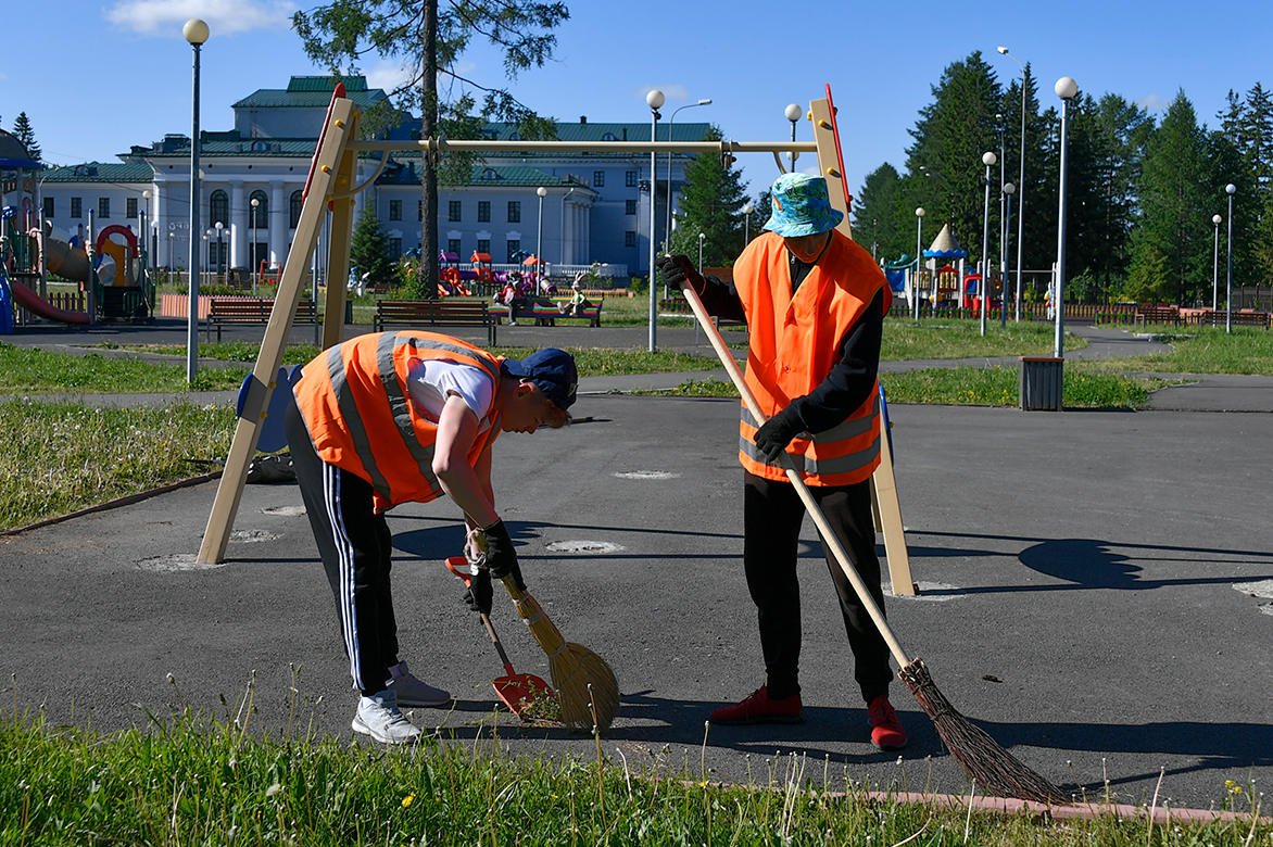 В июне первая группа из 30 человек уже приступила к работе. Ребята благоустраивают территорию санатория-профилактория «Пихтовые горы» и Дворцовый парк площадью 12 гектаров. Девочки занимаются высадкой цветов и прополкой клумб, мальчики подметают тротуары, собирают скошенную траву, убирают детскую площадку.
