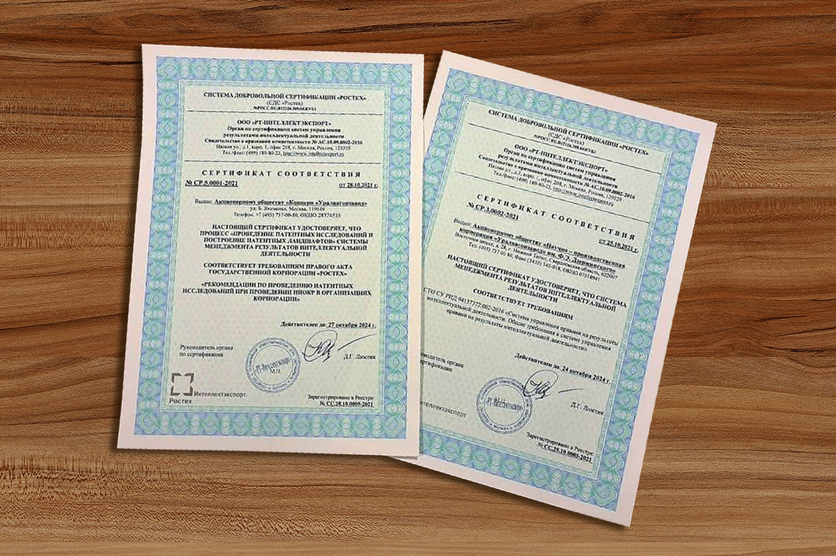 Концерн «Уралвагонзавод» стал первой организацией Ростеха, получившей сертификат соответствия процесса «Проведение патентных исследований и построение патентных ландшафтов» требованиям правового акта Госкорпорации Ростех «Рекомендации по проведению патентных исследований при проведении НИОКР». Этот процесс является крайне важным для патентно-информационного обеспечения при разработке новых образцов техники в рамках ОКР и НИОКР. Комиссия подтвердила руководящую роль Концерна в общей системе управления правами на РИД.