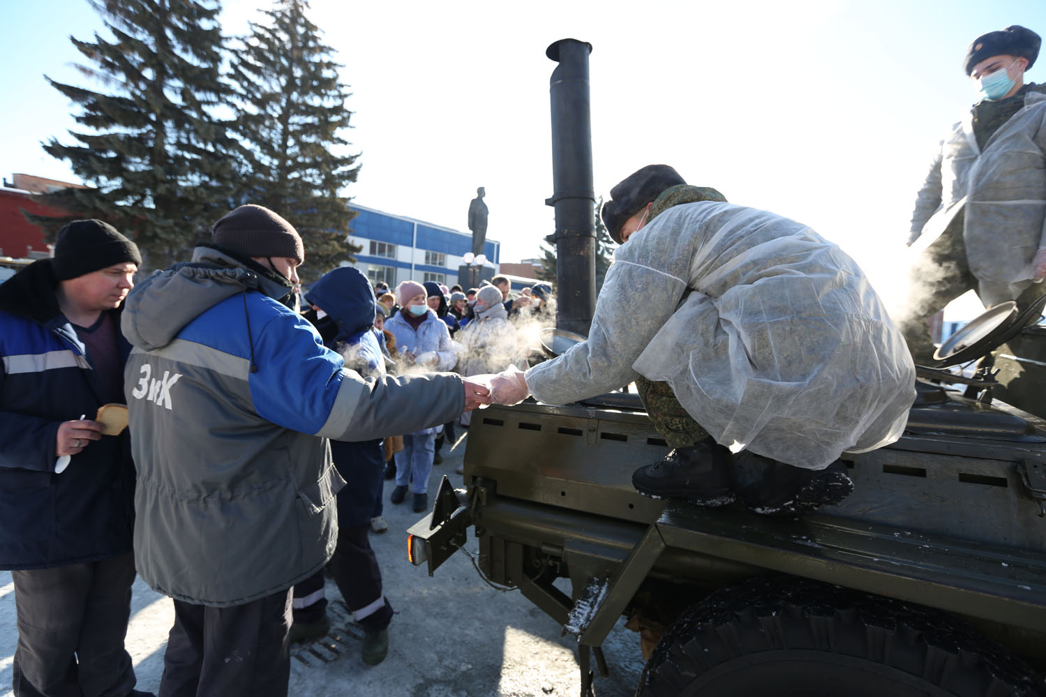 Здесь развернулась полевая кухня, и все желающие могли угоститься солдатской кашей, выпить горячего чая с печеньем и поздравить друг друга с наступающим Днем защитников Отечества - общим праздником всех калининцев!