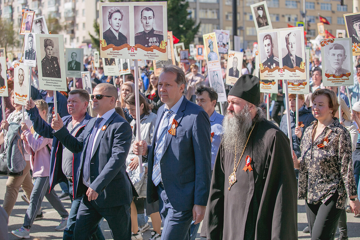 Сотрудников Уралвагонзавода поздравил генеральный директор Александр Потапов. Он прошёл вдоль колонны до начала торжественного шествия и тепло пообщался с заводчанами, в том числе с представителями молодёжной организации предприятия. Молодые сотрудники УВЗ в рамках акции «И тыл был фронтом» с гордостью пронесли портреты тружеников тыла Уральского танкового завода №183 (так назывался Уралвагонзавод в годы войны), где делали не только танки Т-34, но и артпередки, штурмовики Ил-2 и многое другое.