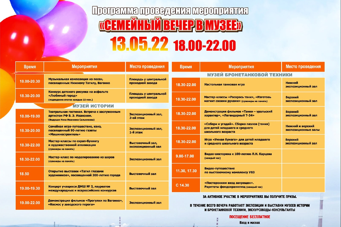 На один вечер Выставочный комплекс Уралвагонзавода (в составе Концерна «Уралвагонзавод» входит в Госкорпорацию Ростех) превратится в поле для игр, место для встречи с заслуженным артистом РФ, концертной площадкой и кинотеатром. 13 мая с 18:00 до 22:00 пройдет «Семейный вечер в музее», тема этого года – 300-летие Нижнего Тагила. Уралвагонзавод приглашает всех жителей и гостей города. Посещение бесплатно.