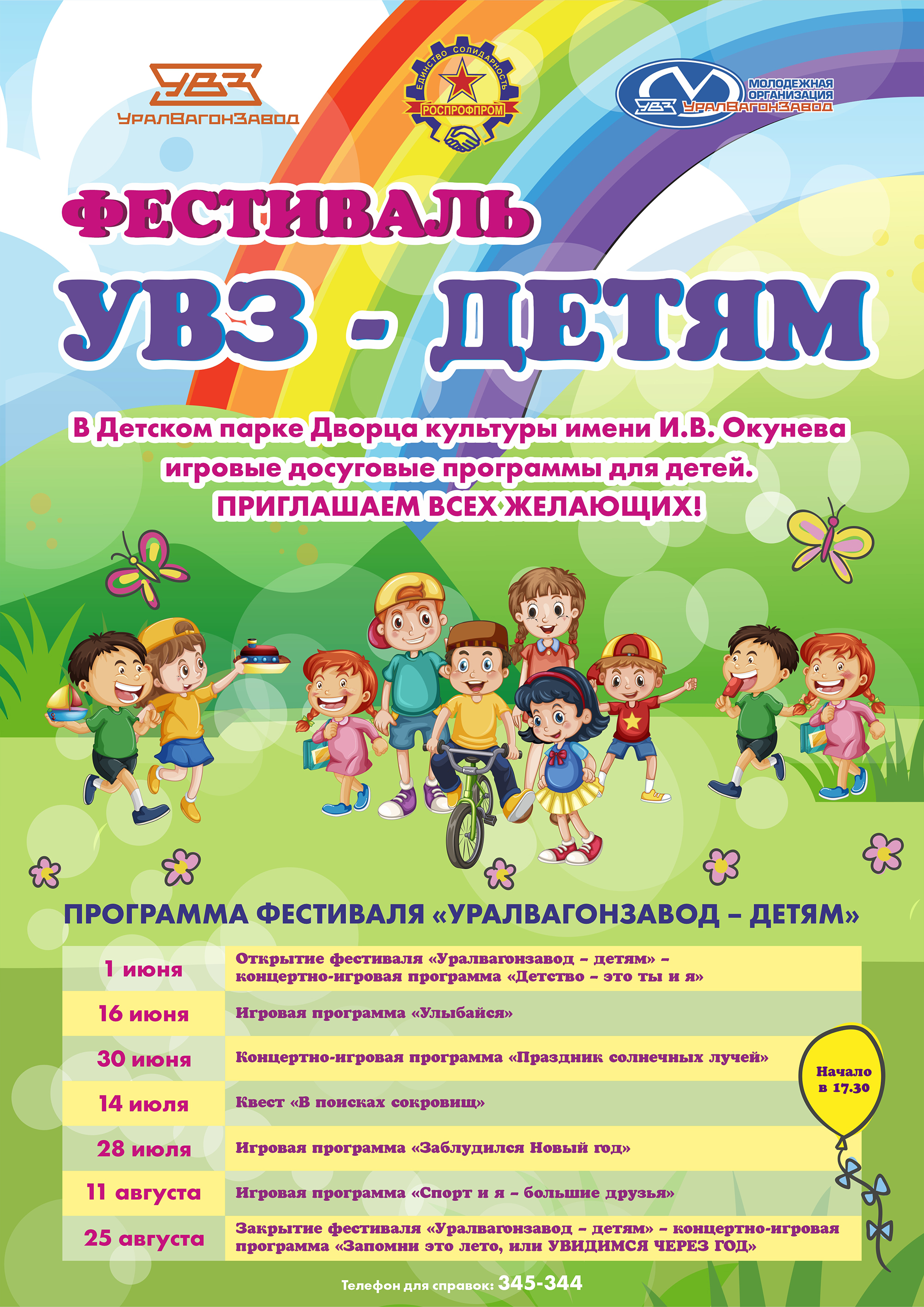 В помощь родителям Уралвагонзавод (в составе Концерна УВЗ входит в Госкорпорцию Ростех) организует для маленьких тагильчан игровой досуг на все три летних месяца. Каждые две недели на детской развлекательной площадке парка ДК им. И.В. Окунева будут проходить программы фестиваля «УВЗ – детям», который посвящен 300-летию Нижнего Тагила. Мероприятия со свободным входом для всех желающих. Открытие фестиваля 1 июня, в День защиты детей.
