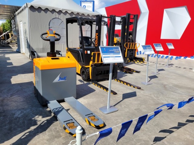 Здесь же можно ознакомиться с натурными образцами гражданской продукции, которая выпускается ПАО "Машиностроительный завод им. М.И. Калинина" в рамках диверсификации производства и импортозамещения: электрическим ричтраком РТ 1700, электрическим штабелером ЭШ 1600, транспортировщиком паллет ТП 2000, электрическим погрузчиком ЭП 2020.