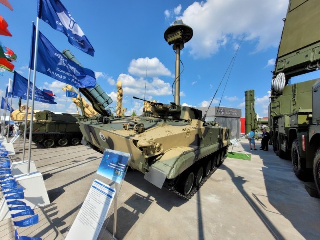 Перед павильоном "В" также представлен подвижный разведывательный пункт ПРП-5. Изделие демонстрируется впервые. Оно предназначено для ведения разведки объектов противника и обслуживания стрельбы наземной артиллерии в различных погодных условиях. ПРП-5 способен осуществлять поиск, обнаружение, распознавание и определение координат открытых и замаскированных, одиночных и групповых, движущихся и неподвижных объектов противника (целей), обслуживание стрельбы артиллерии днем и ночью, разведку местности, сопровождение колонн.