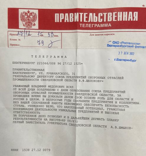 Выражаем от всех нас уверенность, что Россия преодолеет все возникшие трудности, станет сильнее и укрепит своё могущество. Выражаем слова благодарности руководителям предприятий, каждому работнику коллектива предприятия ОПК за высокую ответственность и профессионализм в выполнении государственного оборонного заказа 2022 года и дополнительных задач по поставке ВиВТ, за личное участие специалистов в боевых действиях для решения задач по модернизации военной техники, создаваемой на заводах и превосходству характеристик.