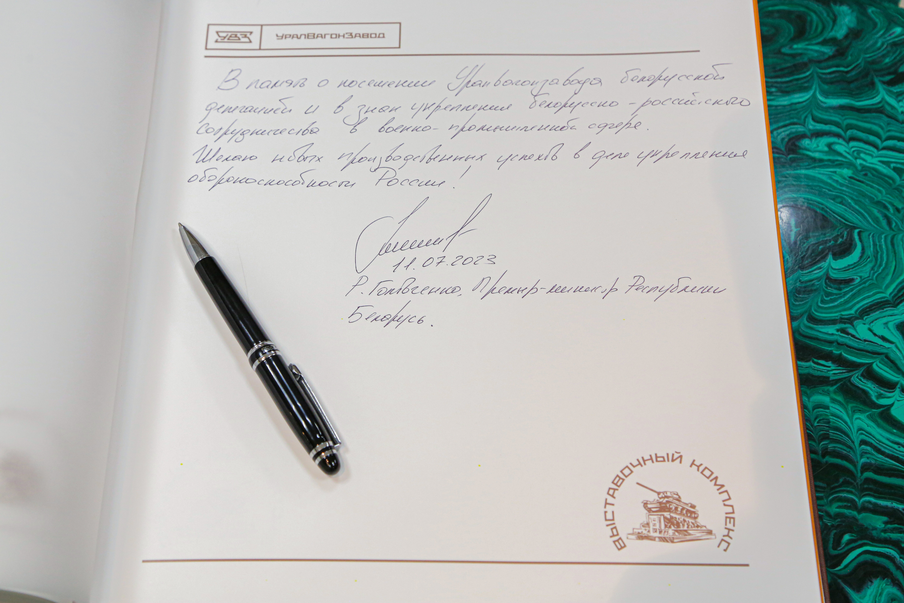 В Книге почетных гостей Выставочного комплекса УВЗ премьер-министр Республики Беларусь Роман Головченко оставил запись: «В память о посещении Уралвагонзавода белорусской делегацией и в знак укрепления белорусско-российского сотрудничества в военно-промышленной сфере. Желаю новых производственных успехов в деле укрепления обороноспособности России!»
