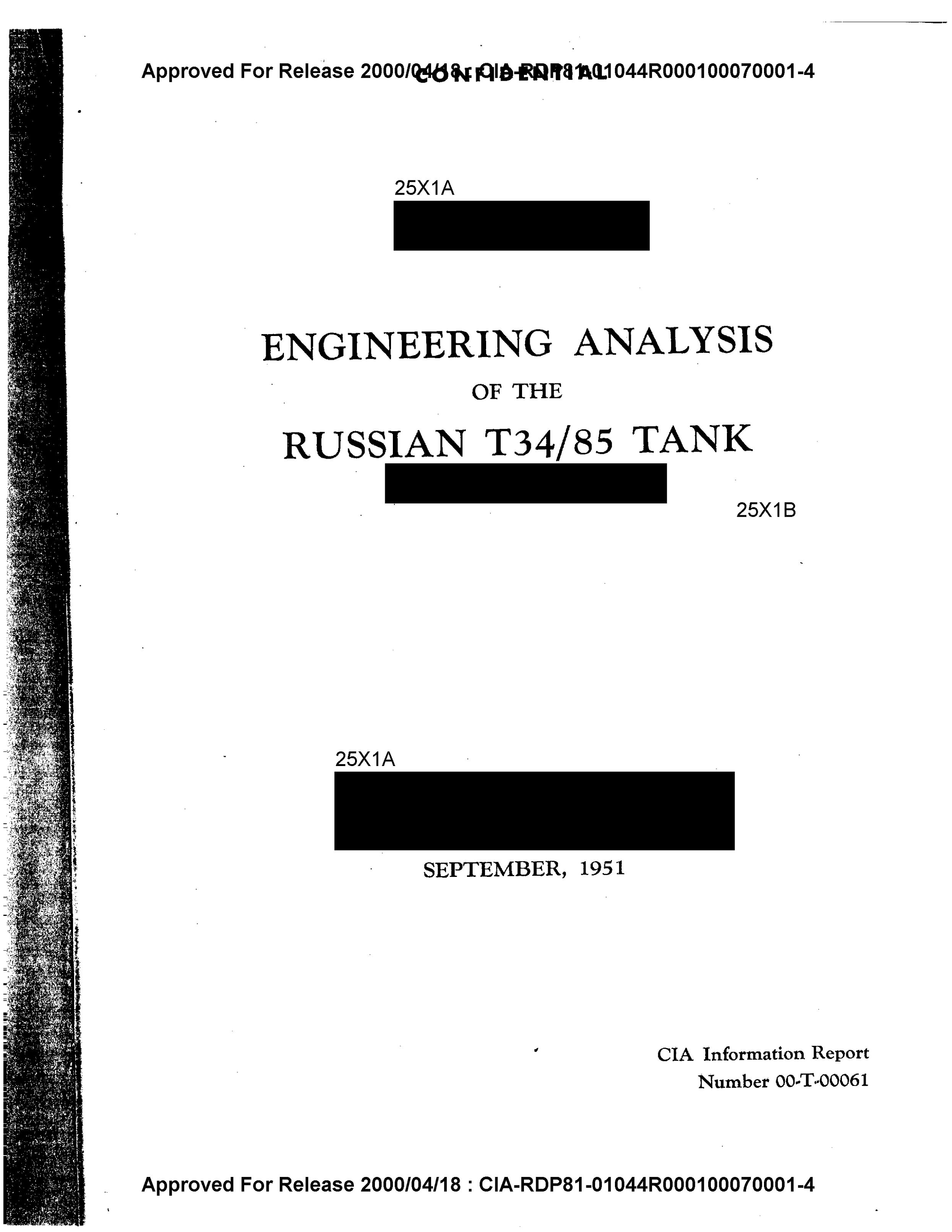 В преддверии юбилея Т-34 историки Уралвагонзавода обнаружили в открытом доступе отчет американской фирмы Chrysler, подготовленный в 1951 году по заказу ЦРУ. В нем произведена техническая оценка трофейного танка Т-34-85 1945 года выпуска, исходя из американских стандартов, конструкторских и эксплуатационных характеристик машины, использованных материалов, методов и технологий производства, а также вновь выявленных усовершенствований по сравнению с более ранними образцами Т-34, изученными в США, Англии и Германии.