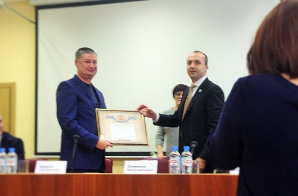Заместитель председателя Комитета Законодательного Собрания Свердловской области по бюджету, финансам и налогам Клименко Михаил Николаевич вручил Почетную грамоту Законодательного Свердловской области генеральному директору предприятия Идрисовову Ринату Махмутовичу за большой личный вклад в результаты деятельности предприятия, способствующие укреплению обороноспособности страны.