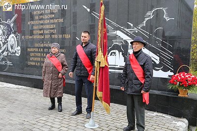 Затем представители администрации ФКП «НТИИМ», ветераны Уральского полигона, представители профсоюза и молодёжной организации возложили цветы к памятнику первым испытателям.