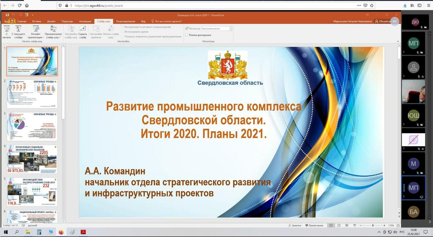 На заседании, проходившем в режиме ВКС, обсудили итоги 2020 года и планы развития региона на 2021 год.С информацией выступил Министр промышленности и науки Свердловской области Сергей Валентинович Пересторонин, отметивший, что в 2020 году региональная промышленность развивалась на том же уровне, что и в предыдущем году. Годовой индекс промышленного производства составил 102,3 % и превышает среднероссийский показатель. За 2020 год при поддержке Правительства СО запустили 94 новых социально-экономических объектов, включая 45 новых производств в сфере промышленности. Среди новых промышленных объектов - 18 новых линий по производству продукции для противодействия распространения коронавирусной инфекции.