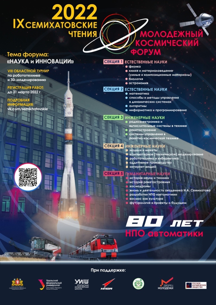 Также в рамках «Семихатовских чтений» традиционно проводится конкурс по робототехнике и 3D моделированию. Финал и награждение состоится 21 апреля 2022 года в Екатеринбурге.