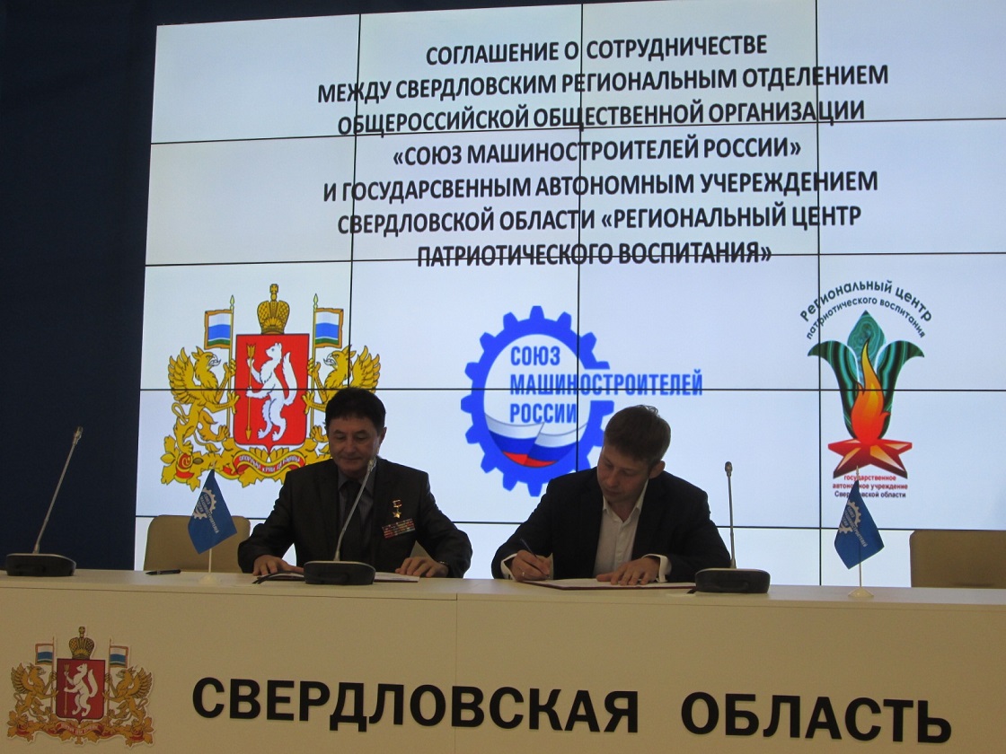 Соглашение было подписано директором государственного автономного учреждения Свердловской области «Региональный центр патриотического воспитания», Героем Российской Федерации Игорем Олеговичем Родобольским и Председателем комиссии по молодежной политике Свердловского регионального отделения Союза машиностроителей России Михаилом Дегтярёвым. Рабочая встреча представителей Свердловского РО и Регионального центра патриотического воспитания запланирована в сентябре текущего года.