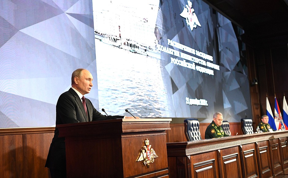 Владимир Путин посетил Национальный центр управления обороной, где принял участие в ежегодном расширенном заседании коллегии Министерства обороны Российской Федерации.