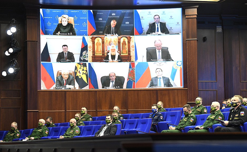 В год 75-летия Победы Министерством обороны реализованы крупные приоритетные и культурные проекты. Военные парады проведены в 28 городах. Традиционно в этом году провели главный Военно-Морской парад. Событием года стало открытие и освещение Главного храма Вооружённых Сил и музейного комплекса «Дорога памяти». В нём размещены данные на 34 миллиона участников Великой Отечественной войны. Уникальный комплекс уже стал центром духовного притяжения военнослужащих и граждан страны. Даже в условиях ограничений его посетило более 1 миллиона человек. Мы чтим историческую память о героях Великой Победы и защищаем её. Отмечу, что по нашей инициативе принят федеральный закон, в котором предусматривается уголовная ответственность за осквернение воинских захоронений и памятников защитникам Отечества.