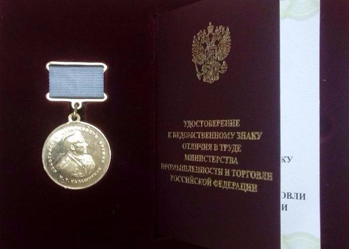 Нагрудный знак «Медаль имени конструктора стрелкового оружия М.Т. Калашникова» учрежден Министерством промышленности и торговли Российской Федерации в 2008 году. В частности, он вручается за большой личный вклад в укрепление обороноспособности страны.